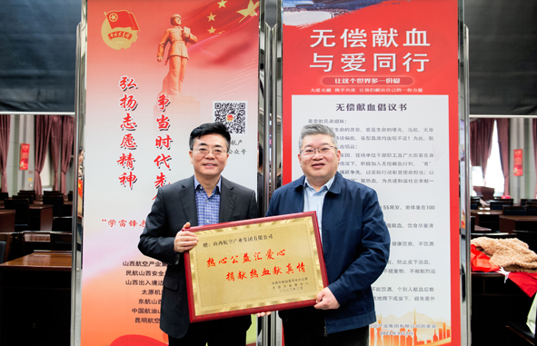 太原市血液中心為航產(chǎn)集團(tuán)頒發(fā)“熱心公益匯愛心 捐獻(xiàn)熱血獻(xiàn)真情”獎牌