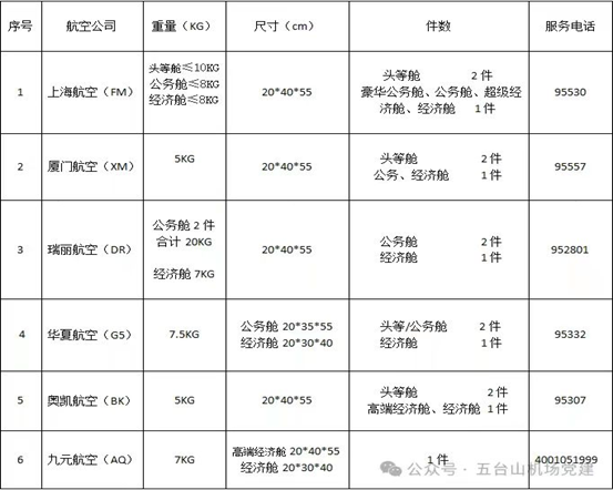 五臺(tái)山機(jī)場執(zhí)飛航空公司的隨身手提行李標(biāo)準(zhǔn)