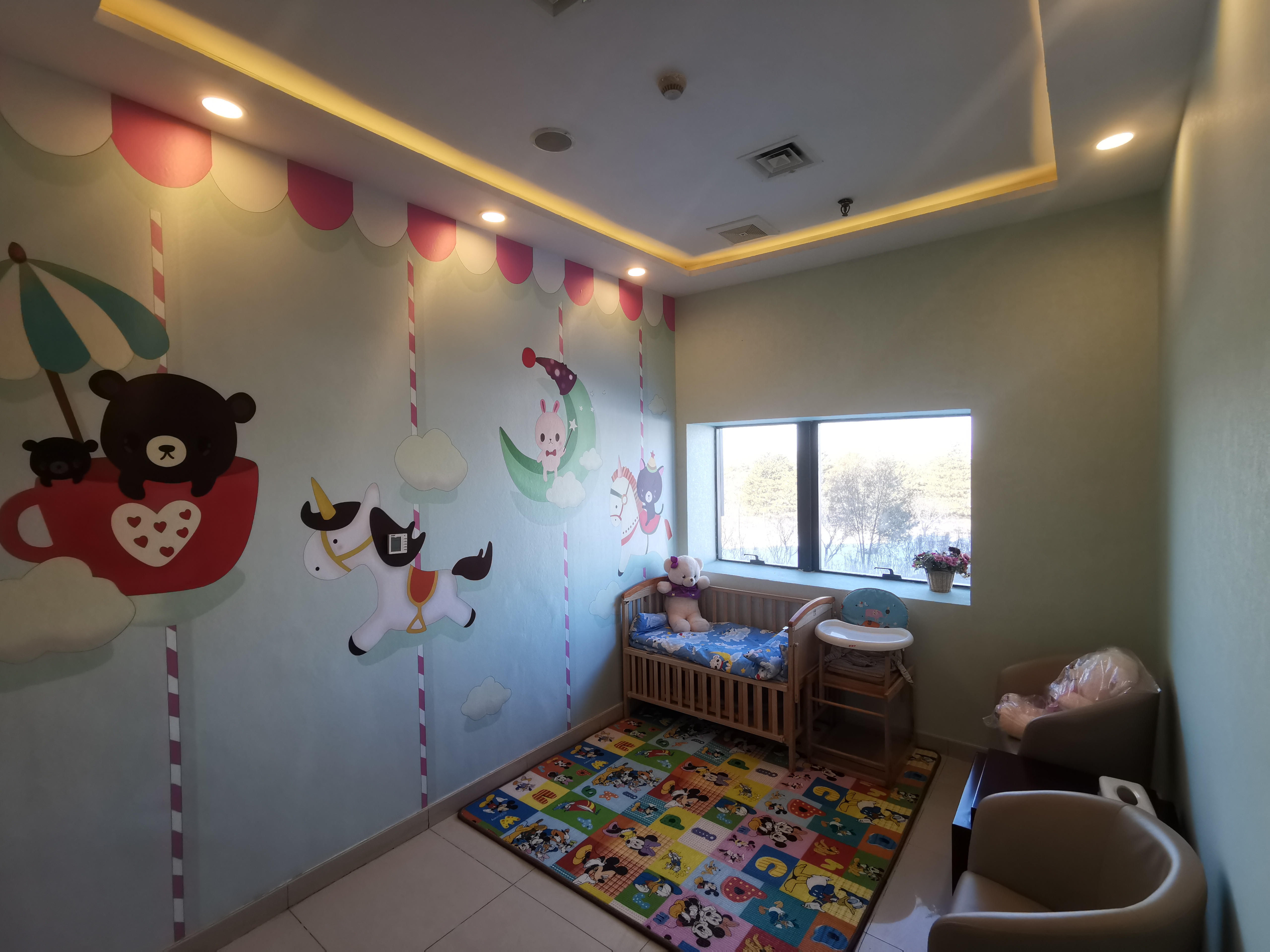 “媽咪小屋”母嬰室,設(shè)有冷熱用水、爬行墊、沙發(fā)座椅、嬰兒床、各種玩具、兒童座椅、嬰兒座便器、各種型號紙尿褲等。